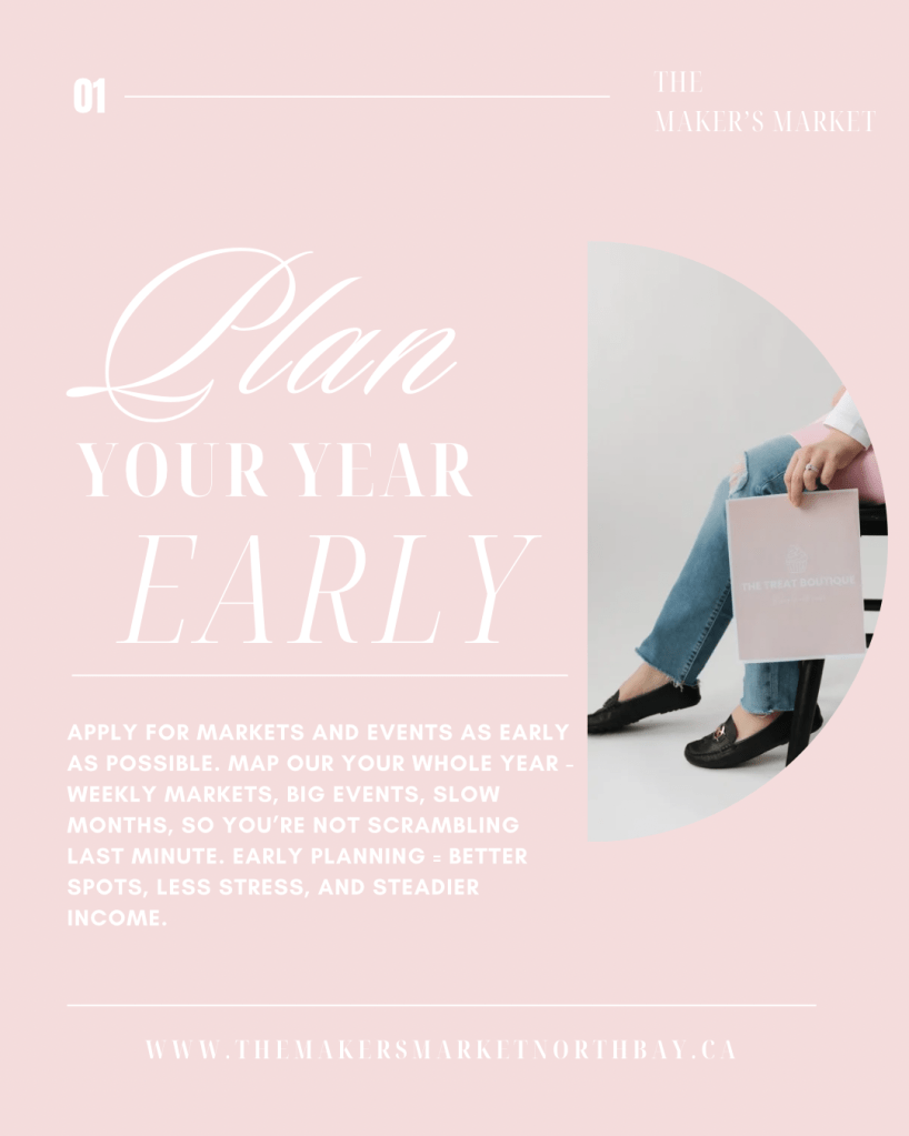 One of the most powerful things you can do for your business is to plan your year as early as possible. Booking markets ahead of time gives you clarity, confidence, and direction. Instead of scrambling month to month, you’ll know where your business is showing up and can prepare accordingly.