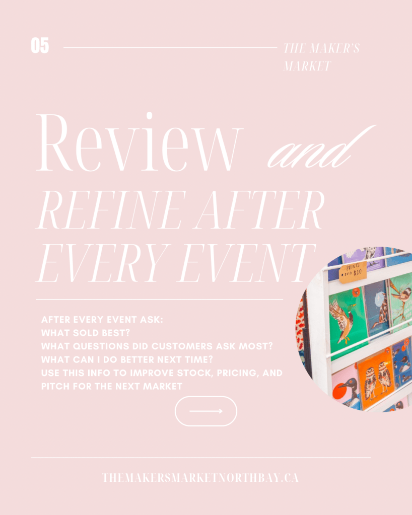 These reflections help you refine your inventory, pricing, booth setup, and market choices. Growth comes from learning—and every event offers valuable insight.